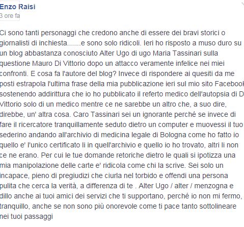 Le reazioni scomposte dell’onorevole Raisi si inaspriscono. Qui a fianco potete leggere il suo status su Facebook che contiene numerose notizie non rispondenti al vero: dagli amici dei servizi attribuitimi (i miei amici sono, caso mai, i brigatisti a cui lui ha dedicato tanta attenzione polemica) alle sottolineature della sua condizione di ex parlamentare, cosa che non mi appartiene: è facilmente verificabile che nel post oggetto della sua replica aggressiva l’ho citato entrambe le volte come onorevole Raisi. E del resto come potrei mancare di rispetto a una personalità pubblica che ha dato risalto al ruolo svolto dal mio blog per la sua stessa ricerca sulla strage di Bologna? Io gliene sono grato e gli sarò ancora più grato se abbassa i toni, evita gli insulti (che io non gli ho mai rivolto) e accetta un confronto civile.