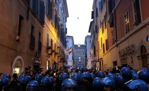 Blitz dei movimenti per il reddito, la casa e l’ambiente che hanno tentato di occupare Sant’Andrea delle Fratte. Sit-in a Campo de’ Fiori. Corteo selvaggio attorno al Parlamento, forzato blocco di agenti.